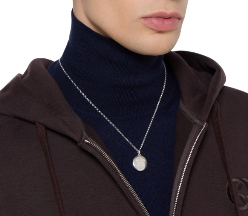 In the Fall Winter 2025 collection, the symbolic phrase “Blind for Love” returns atop new creations. A reference to Gucci’s continual logo narrative, an Interlocking G motif features on the back of the round pendant, another distinctive House symbol. This necklace can be worn on both sides, to reveal the engraving of the wearer’s choice.