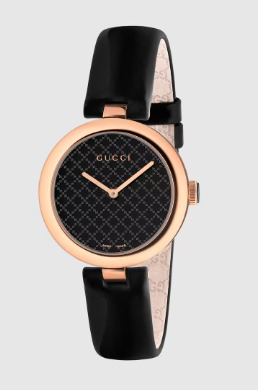 The Diamantissima watch features the signature Diamante pattern etched into the case. The same motif is presented on the black dial in a tonal interpretation to convey a printed fabric effect.
