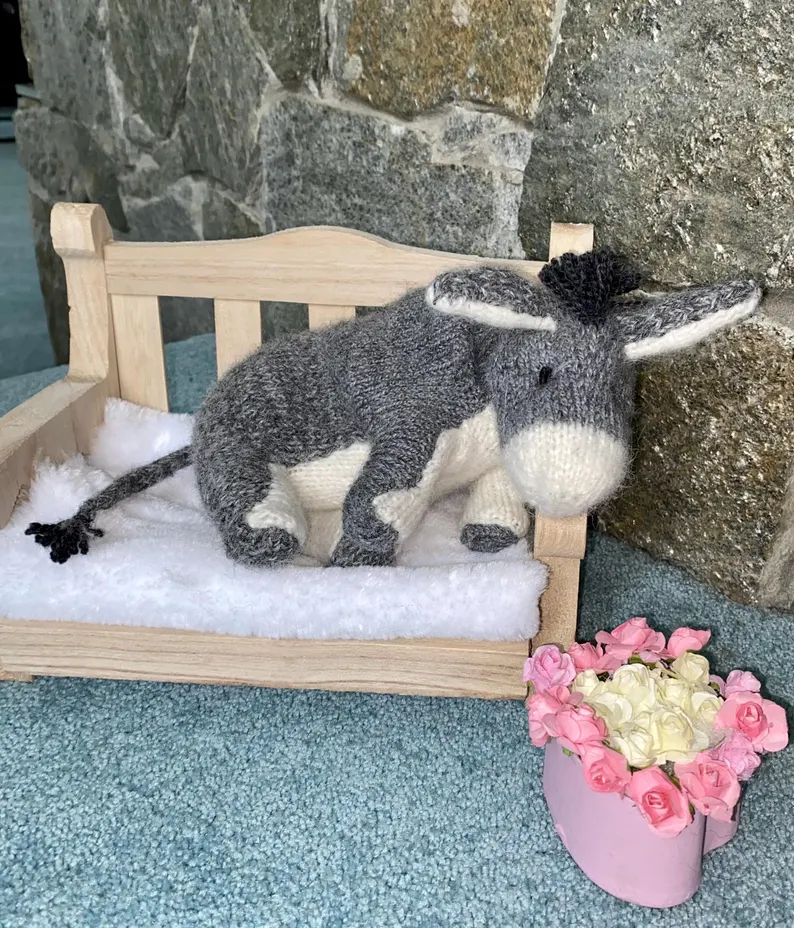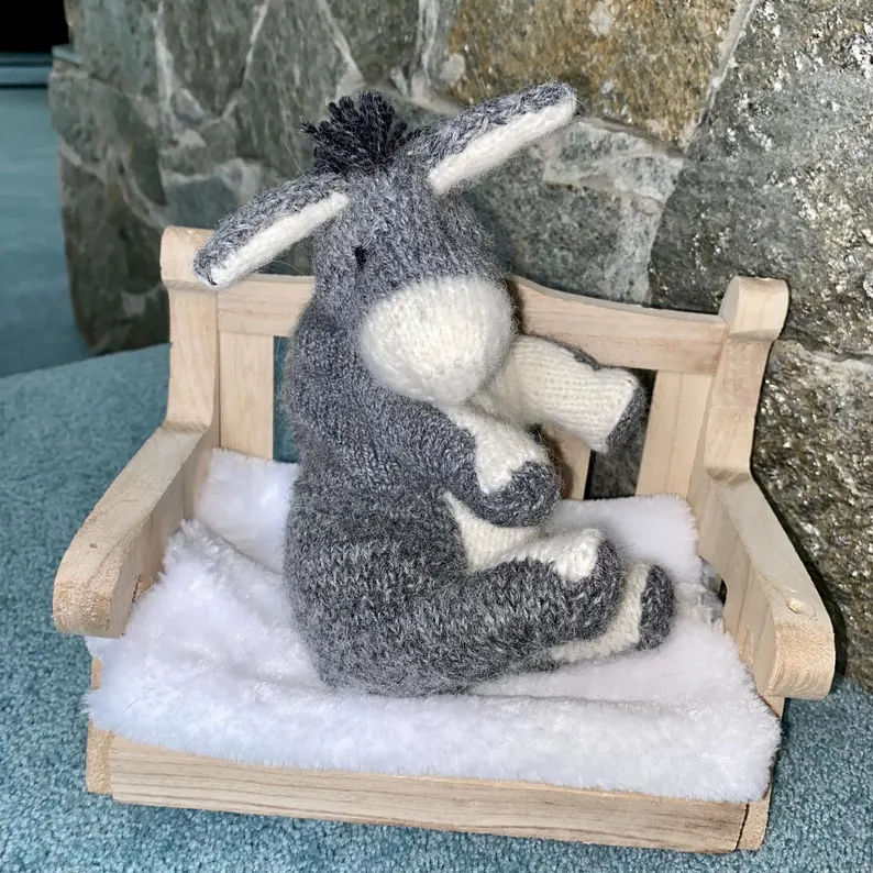 Eeyore the Donkey – A Hand-Knitted Storybook Friend Looking for a New Home Hello… I’m Eeyore. A little sad sometimes, but always hopeful. I’m lovingly hand-knitted from the softest baby alpaca yarn, filled with a mix of cotton yarn and hypoallergenic stuffing to make me extra cuddly and poseable. My eyes are delicately hand-embroidered, and my spirit is quiet but kind. Each toy is carefully handmade over many hours to ensure the best quality and unique charm. Once finished, I’m gently wrapped with love, placed in a lovely gift box, and ready to travel by post to meet my new friend. I’m ready to share quiet joys and gentle adventures. And if one morning you forget to be happy… I’ll be there to softly remind you. A heartwarming gift for fans of A. A. Milne’s beloved tales — perfect for children, grandchildren, or grownups who still believe in the magic of childhood.”