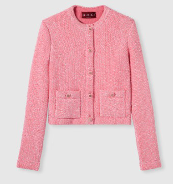 Coats, jackets, and dresses blend discreet elegance with refined details in the Pre-Fall 2025 collection. Created from a fine viscose jacquard with a bon-ton feel, this pink cardigan showcases Double G buttons for an elevated finish.