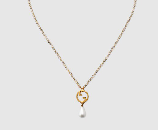 The Gucci Blondie jewelry line, which denotes the Round Interlocking G motif, is enriched for Pre-Fall 2024 with a timeless quality thanks to delicate resin pearls and crystals. A sparkling crystal necklace, complete with a cut-out logo pendant and resin pearl drop. Can be paired with other accessories from the same selection.