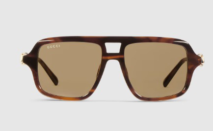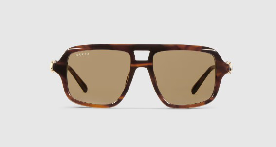 In the Fall Winter 2025 collection, the House celebrates its longstanding equestrian heritage. These navigator frame sunglasses reveal a through-Horsebit detail and solid brown lenses.