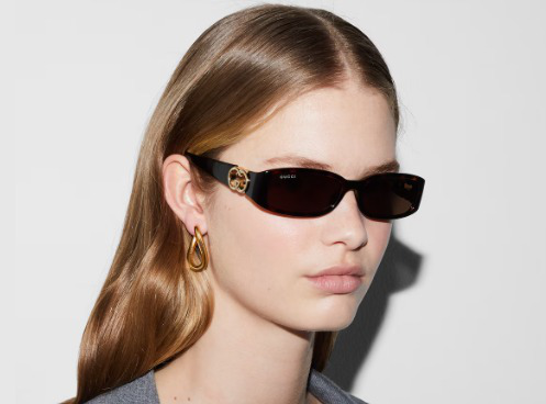 The Pre-Fall 2024 eyewear collection successfully combines the coveted silhouettes of bygone decades with a contemporary logo feel. Here, a shiny dark tortoiseshell injection frame is paired with an Interlocking G motif.