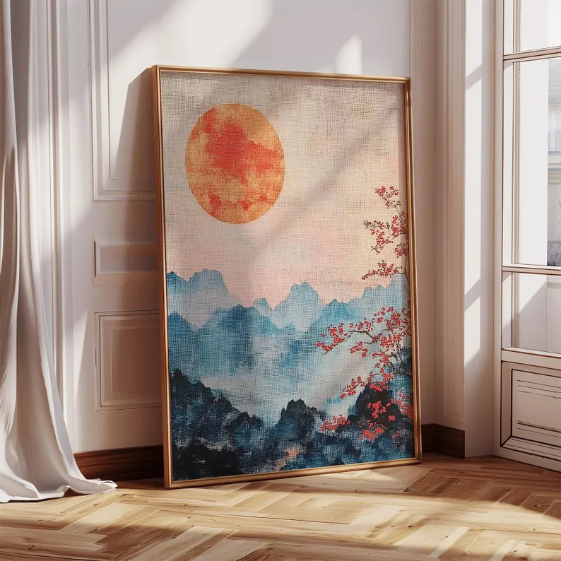 This Japanese Mountain Art print captures the quiet power of nature through a wabi sabi lens. Faded blue mountains rise through delicate mist, anchored by a glowing red sun and fine cherry blossom details. The muted texture and grain of the canvas give this piece an aged, natural feel—beautiful in its simplicity and subtle variation.