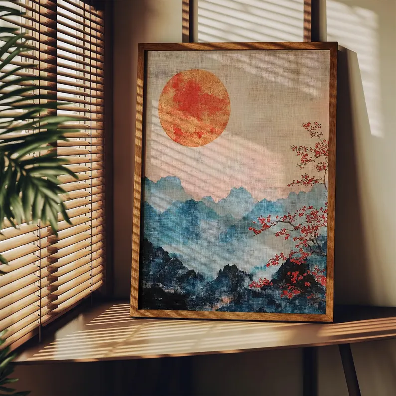 Japanese Mountain Art Wabi Sabi Print with Red Sun and Misty Blue Landscape – Minimalist Nature Wall Decor | Traditional Asian Decor Highlights