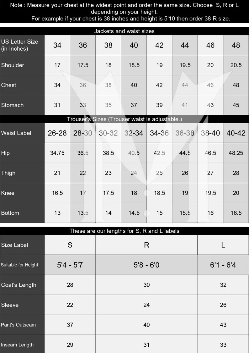 Customization available—just send us your measurements (in inches: Chest, Stomach, Waist, Hip, Shoulder, Height, and Trouser Length) after ordering.