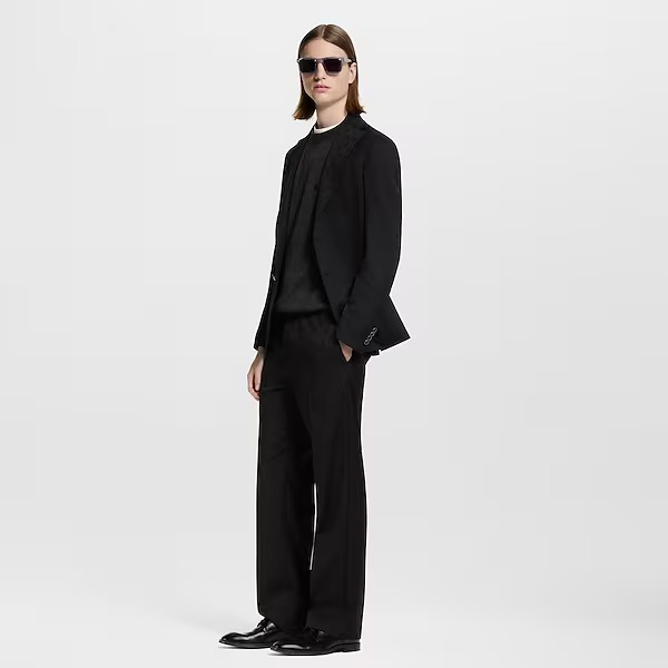 These elegant black tailored pants have a fluid silhouette with a comfortable waist that is elasticated at the back. They are crafted from fine virgin wool ennobled with an allover Monogram jacquard with a soft luster. A woven Marque L.Vuitton Déposée patch signs the rear waistband. Pair with a matching Napolitana jacket for an effortlessly elegant suit.