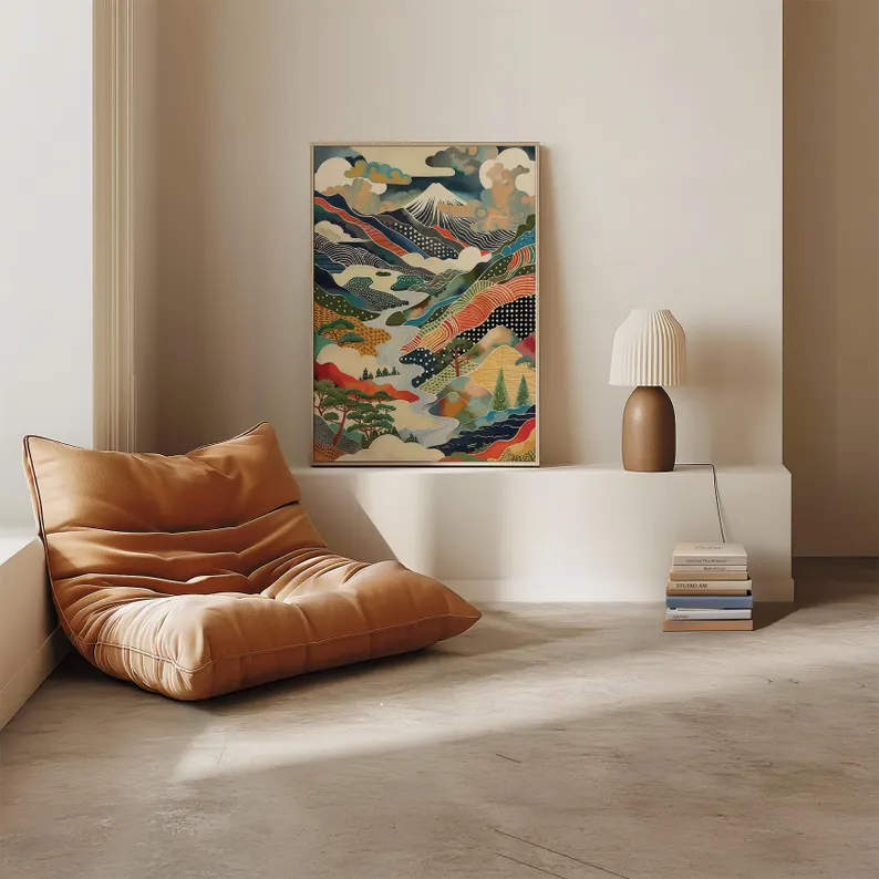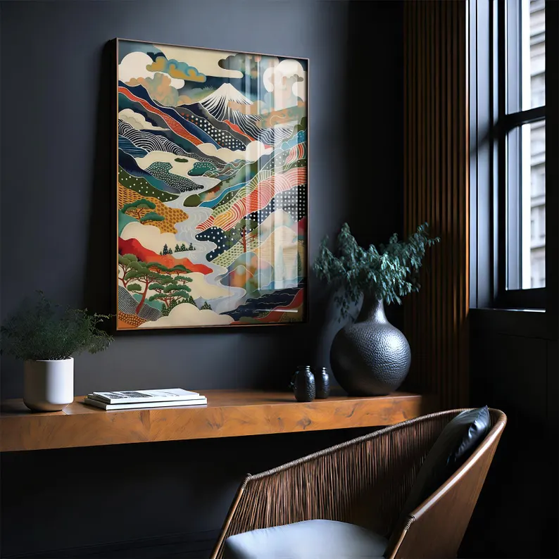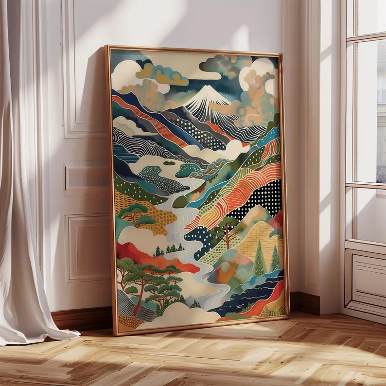 Mount Fuji, Japan’s most revered peak, stands as a symbol of tranquility, strength, and natural beauty. This Japanese-inspired art print re-imagines the iconic mountain through a modern artistic lens, using bold patterns, flowing landscapes, and a harmonious colour palette. The contrast between fluid shapes and structured elements mirrors the balance found in traditional Japanese art, creating a captivating focal point for any interior.