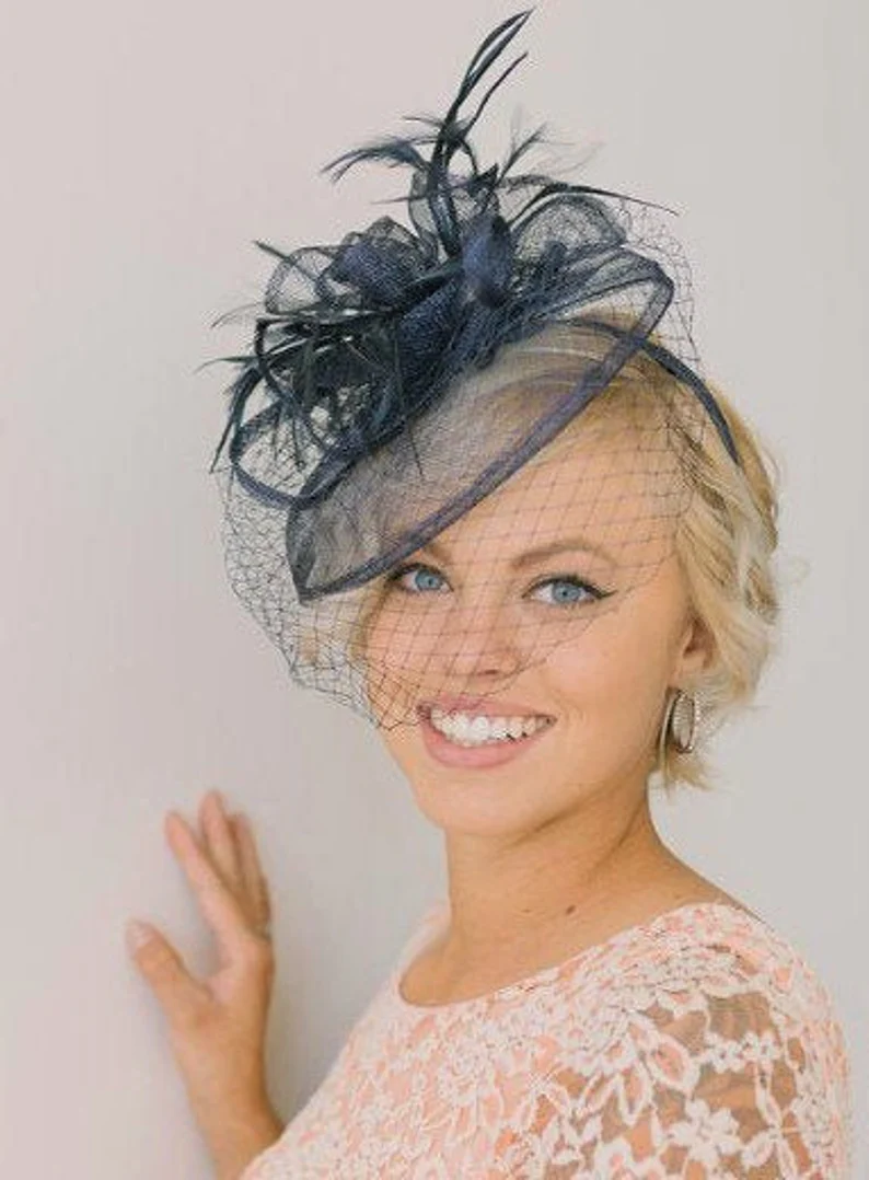 Navy Blue Fascinator on headband Women’s Tea Party Hat Hat with Veil Kentucky Derby Hat Fancy Hat Tea Party Hat wedding hat,