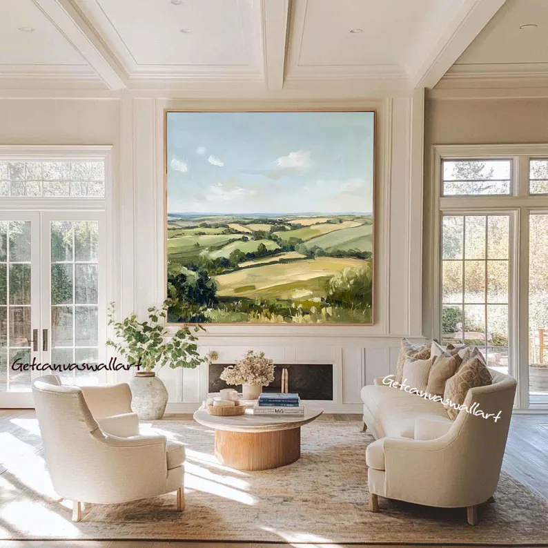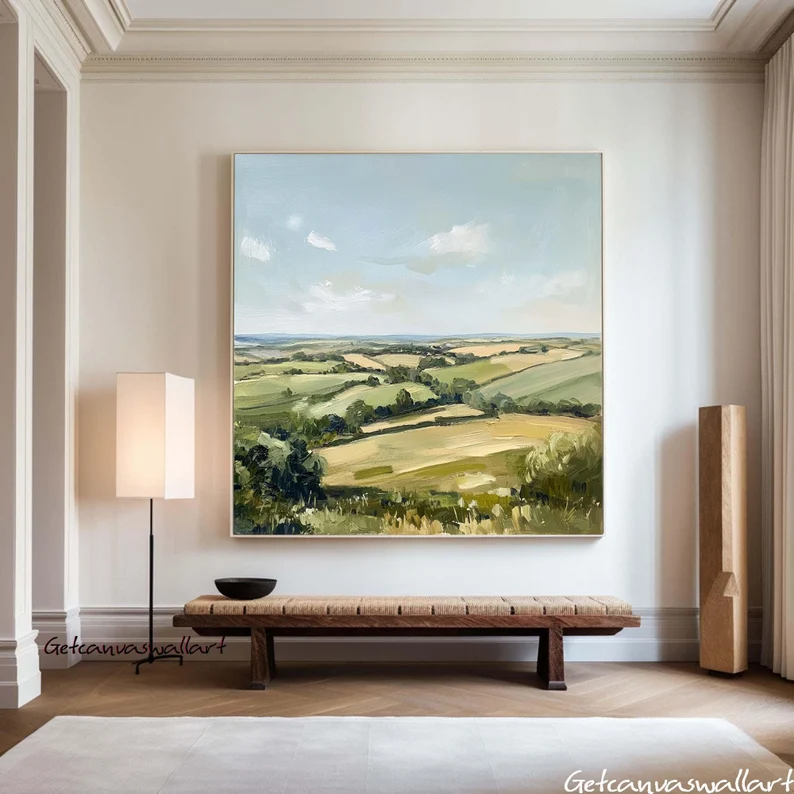Neutral Abstract Landscape Painting Green Texture Canvas Art Vintage Landscape Art Farmhouse Decor Countryside Green Field Nature Painting