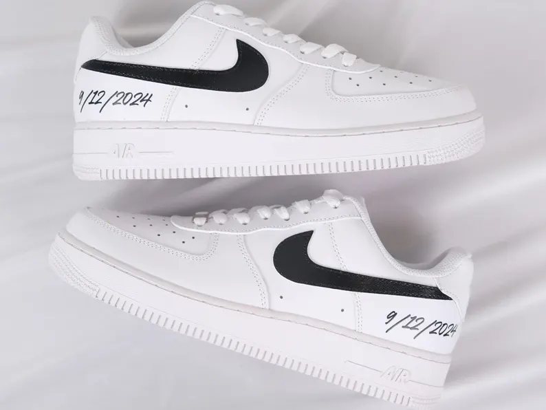 Both the bride and groom’s shoes are designed with paint, drawing and pearls or blings on the 2 outer swooshes ❤️