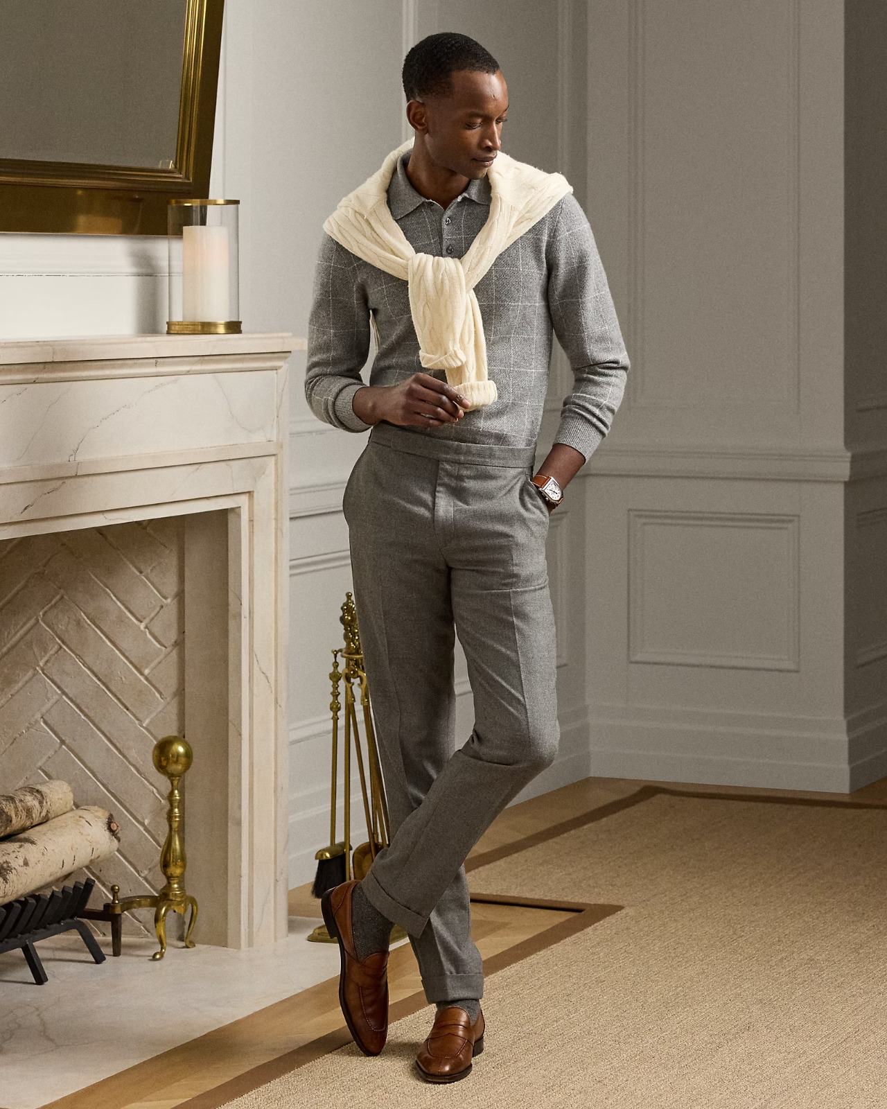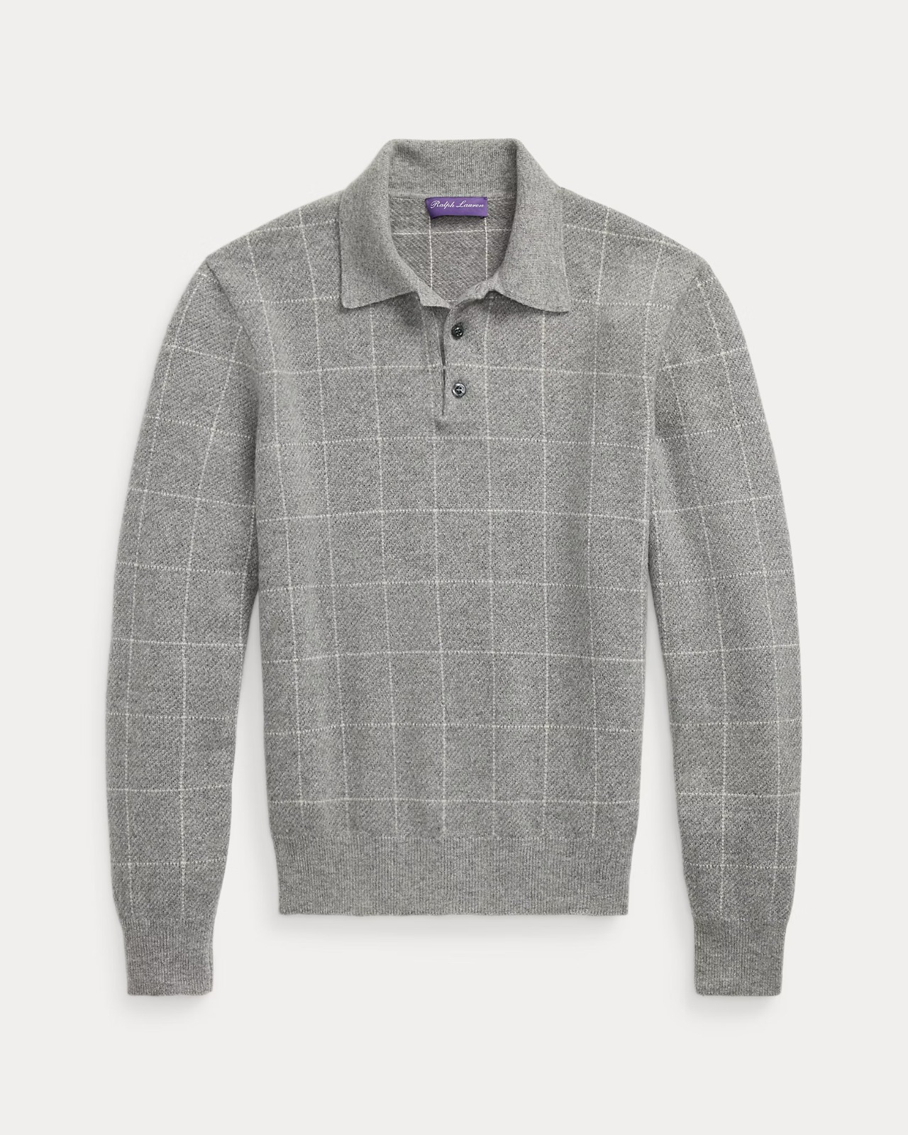 Uniting multiple fine-gauge cashmere yarns with a mix of jacquard- and intarsia-knitting technique, this Italian-crafted sweater is an exemplary take on tone and texture. The lightweight layer reimagines Ralph Lauren’s iconic Polo shirt silhouette and features considered details such as genuine mother-of-pearl buttons. Its classic windowpane pattern draws inspiration from a woven fabric that is used in the Purple Label collection.
